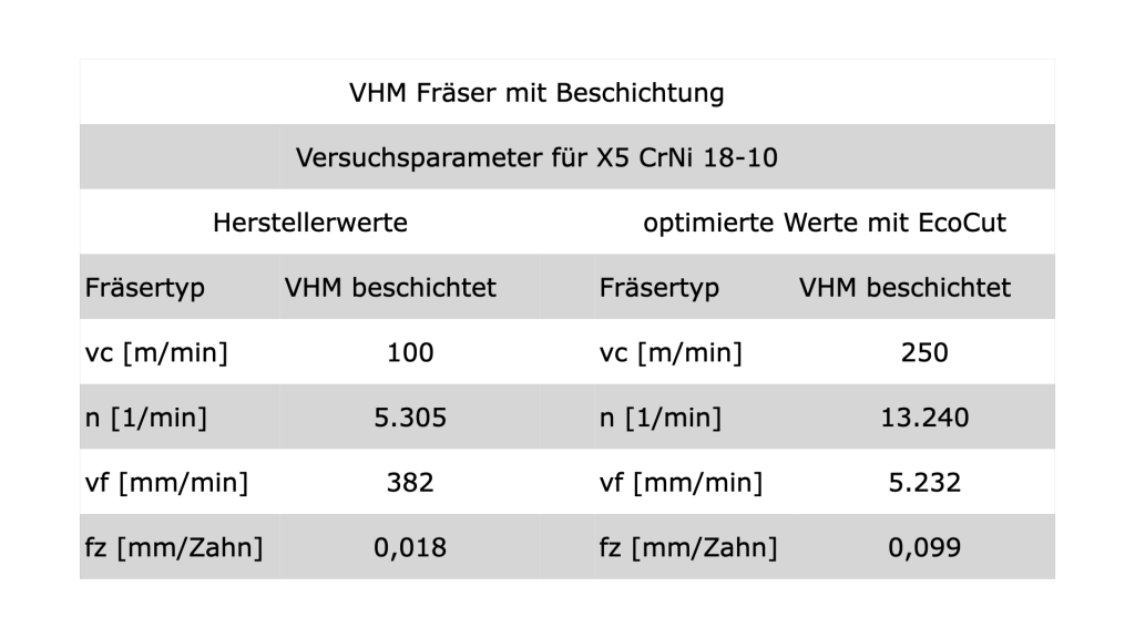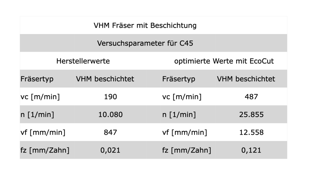 Direkter Vergleich von Herstellerwerten und den optimierten Ergebnissen von EcoCut
